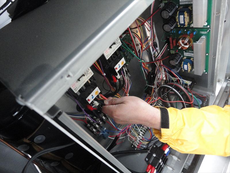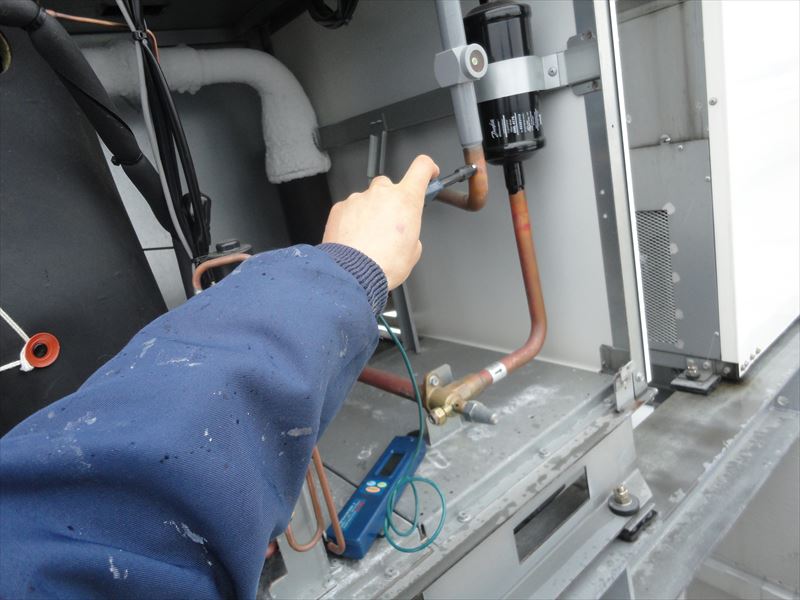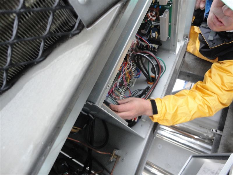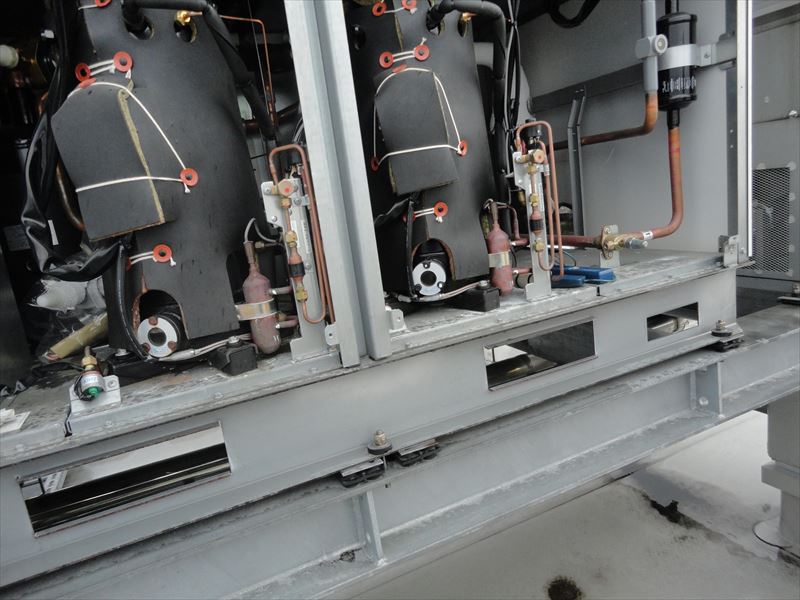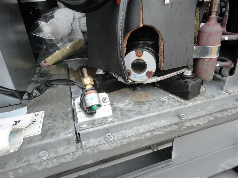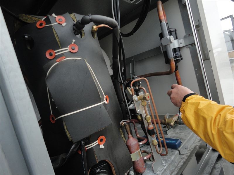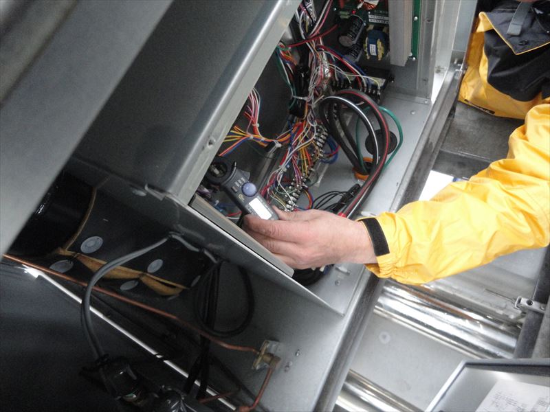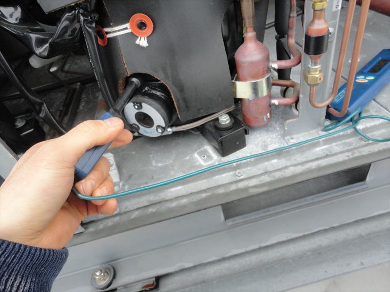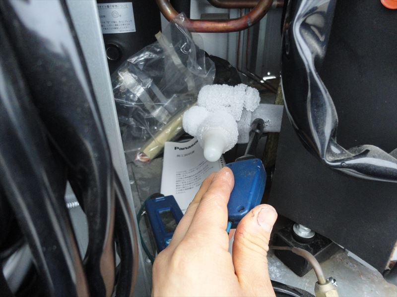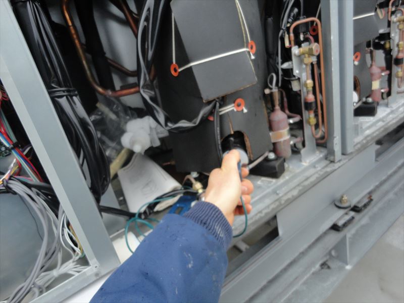 2018/12/13 冷凍機室外機 サイトグラス冷媒液量測定 圧縮機の過熱測定 圧縮機の過熱測定 圧縮機電圧測定 圧縮機電流値測定 圧縮機電流値測定 吸入ガス温度測定 室外機内部 点検中 点検中 点検中